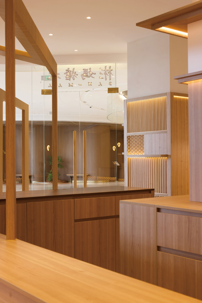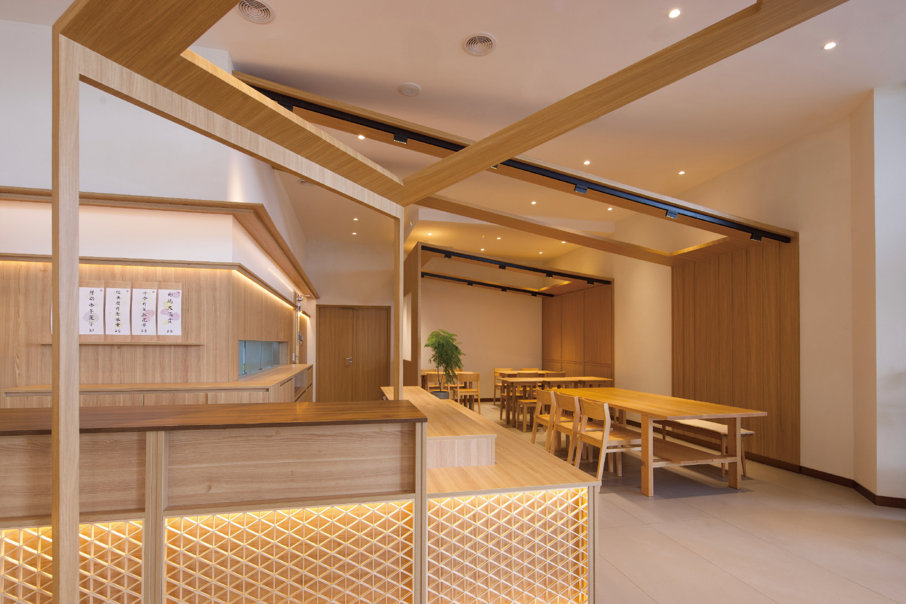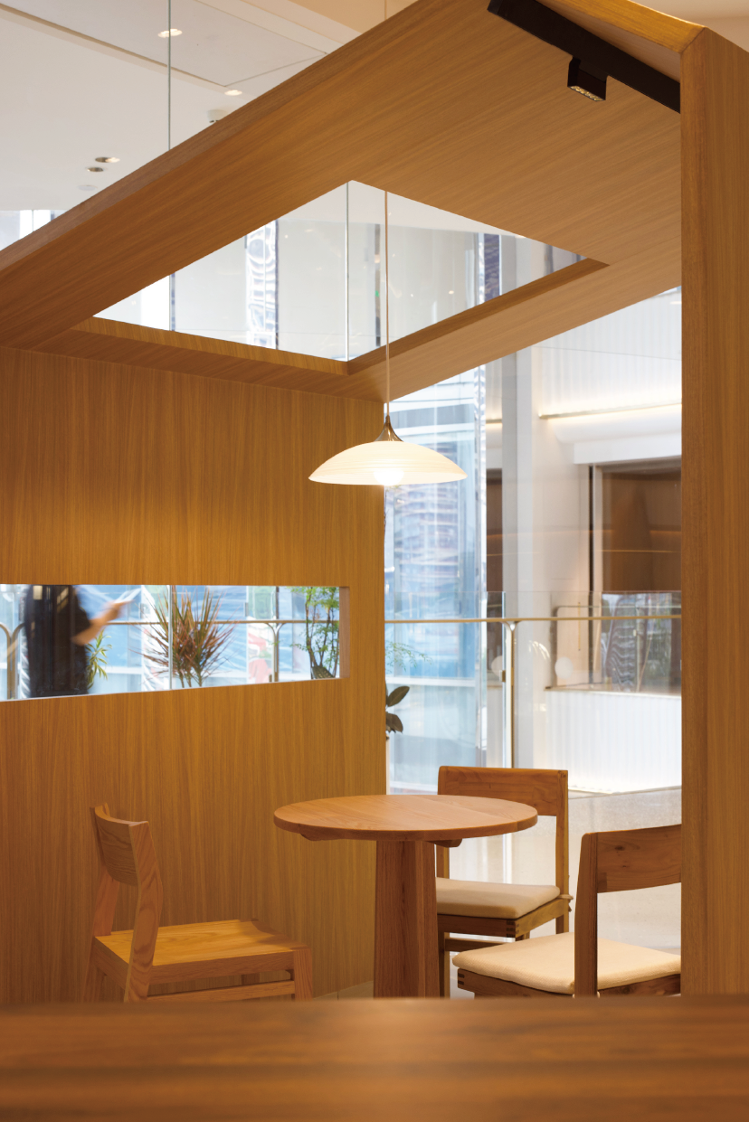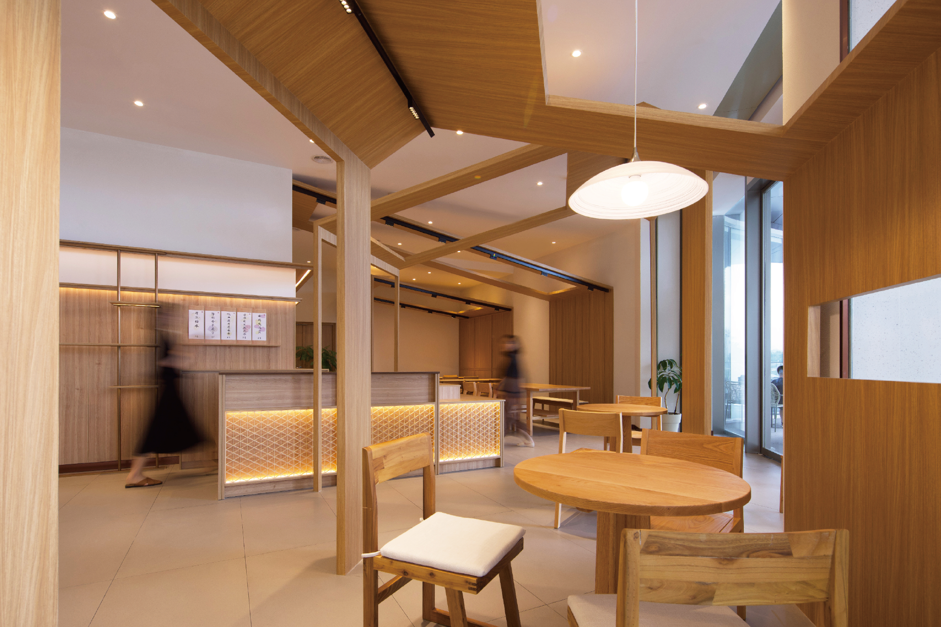 将室内空间当作一处聚合的自然院落展开布局,仿佛乡野间的微型聚落高低有致。交叠的小房子自然形成外立面的形态,通过转角行至店前便可见院落重叠的全貌。我们在室内空间中一共置入了四个开放的小屋,以形成聚集的院落组合。人的动线也随之自然摆动,让人在室内可以穿梭游走,驻足停下每个角度都是不同的景观。我们将每个小屋都结合功能性进行开窗与开洞处理,让温暖的灯进来、让绿植进来,自然也吸引着顾客进来。