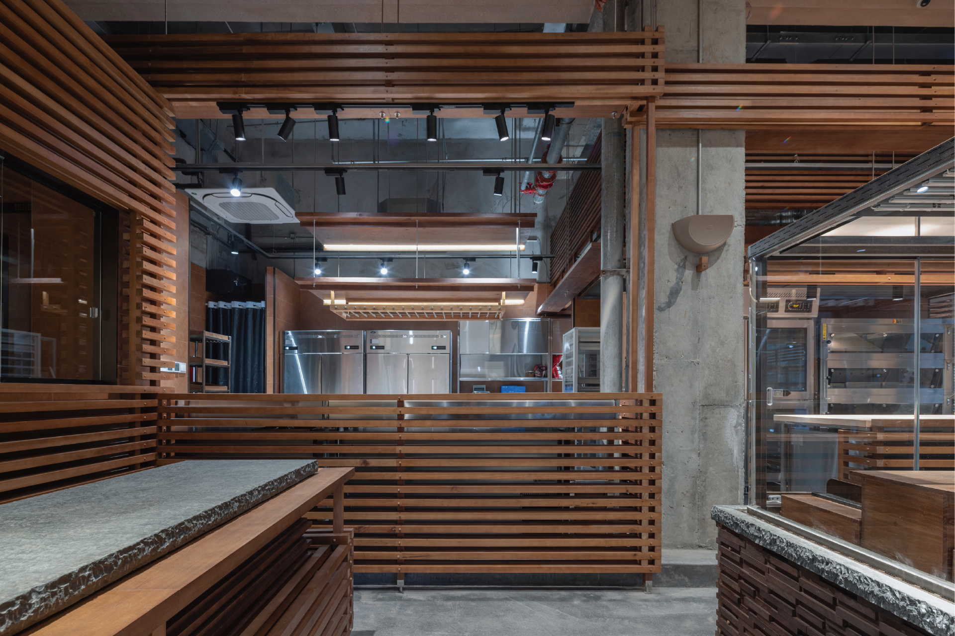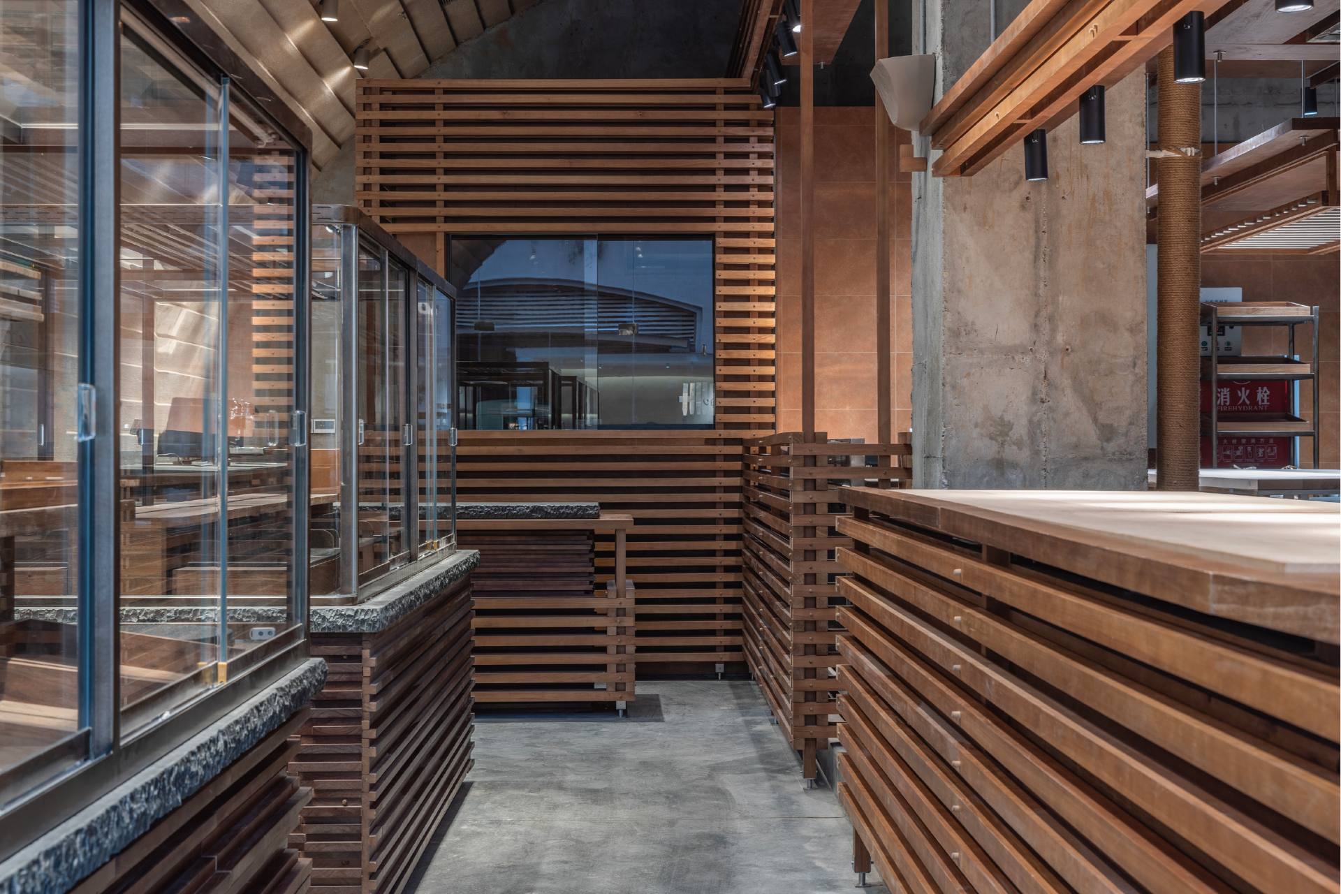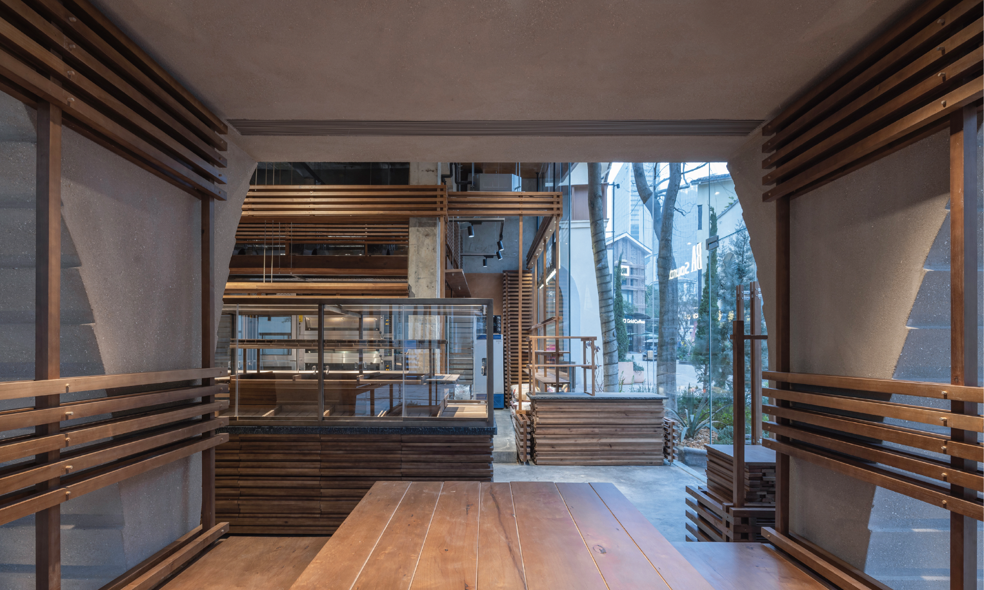 为保证室内的通透与秩序,选择以轻型搭接的木构模块界定出烘焙制作、收银、客座区域。木构模块可根据功能需求的变化,灵活拆组。空间中以基础的砂、石、木作为主要素材,呼应着自然发酵所需的原料亦是基础而纯粹的。