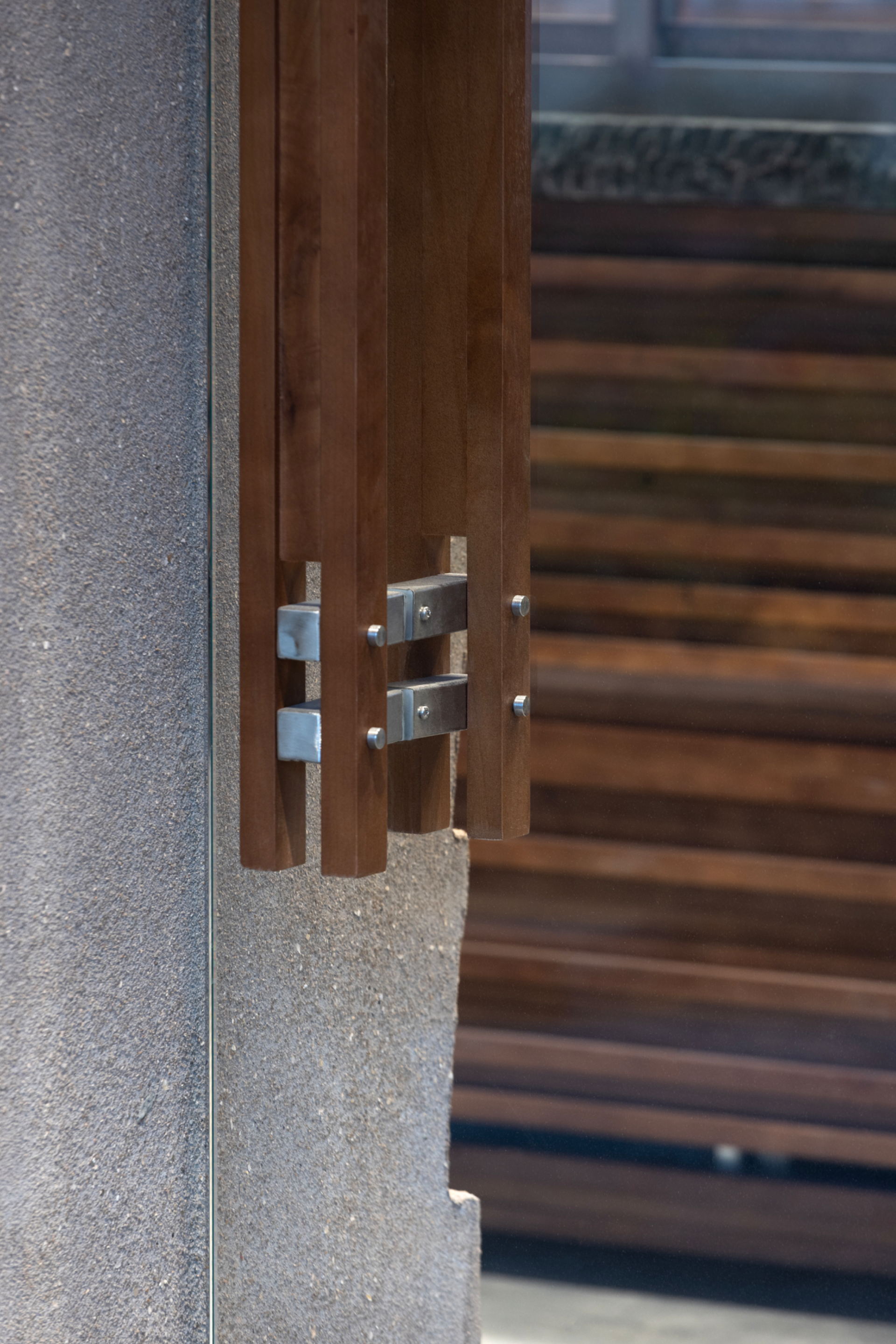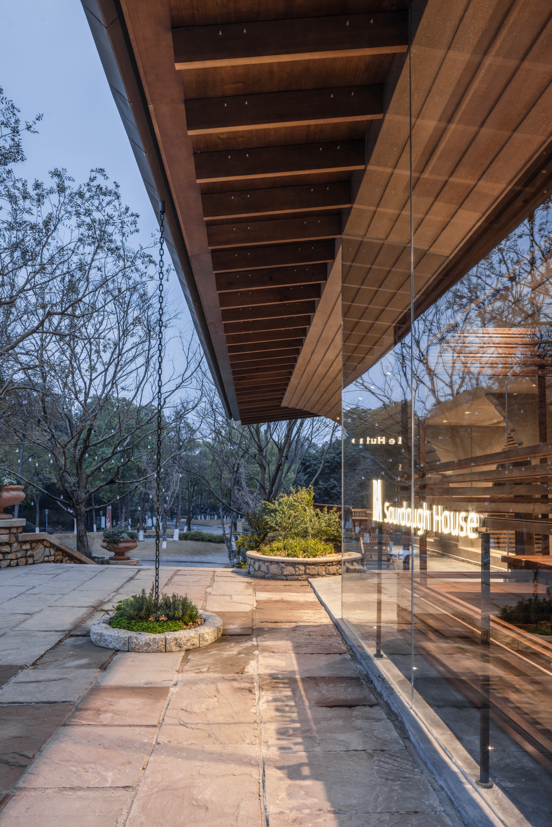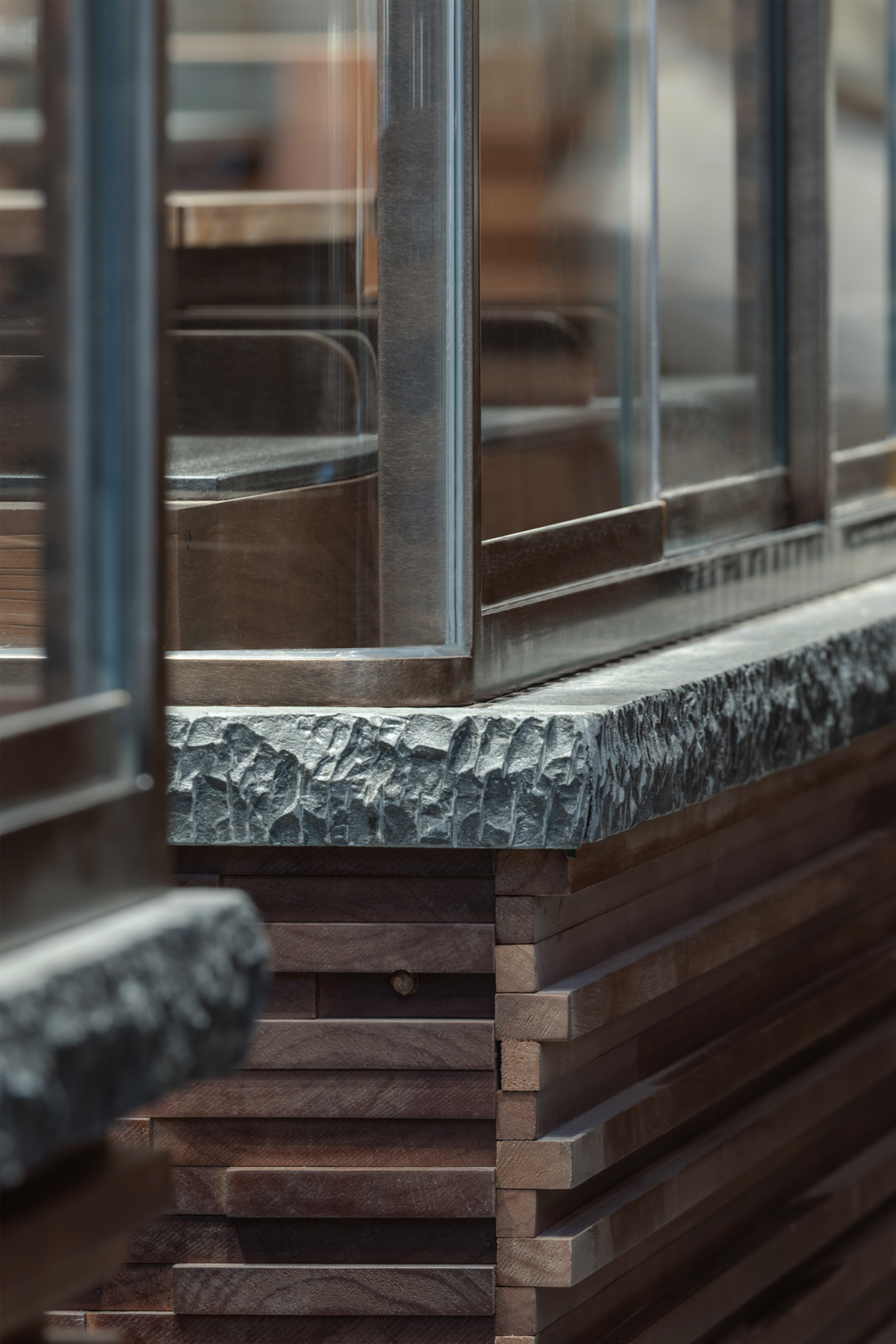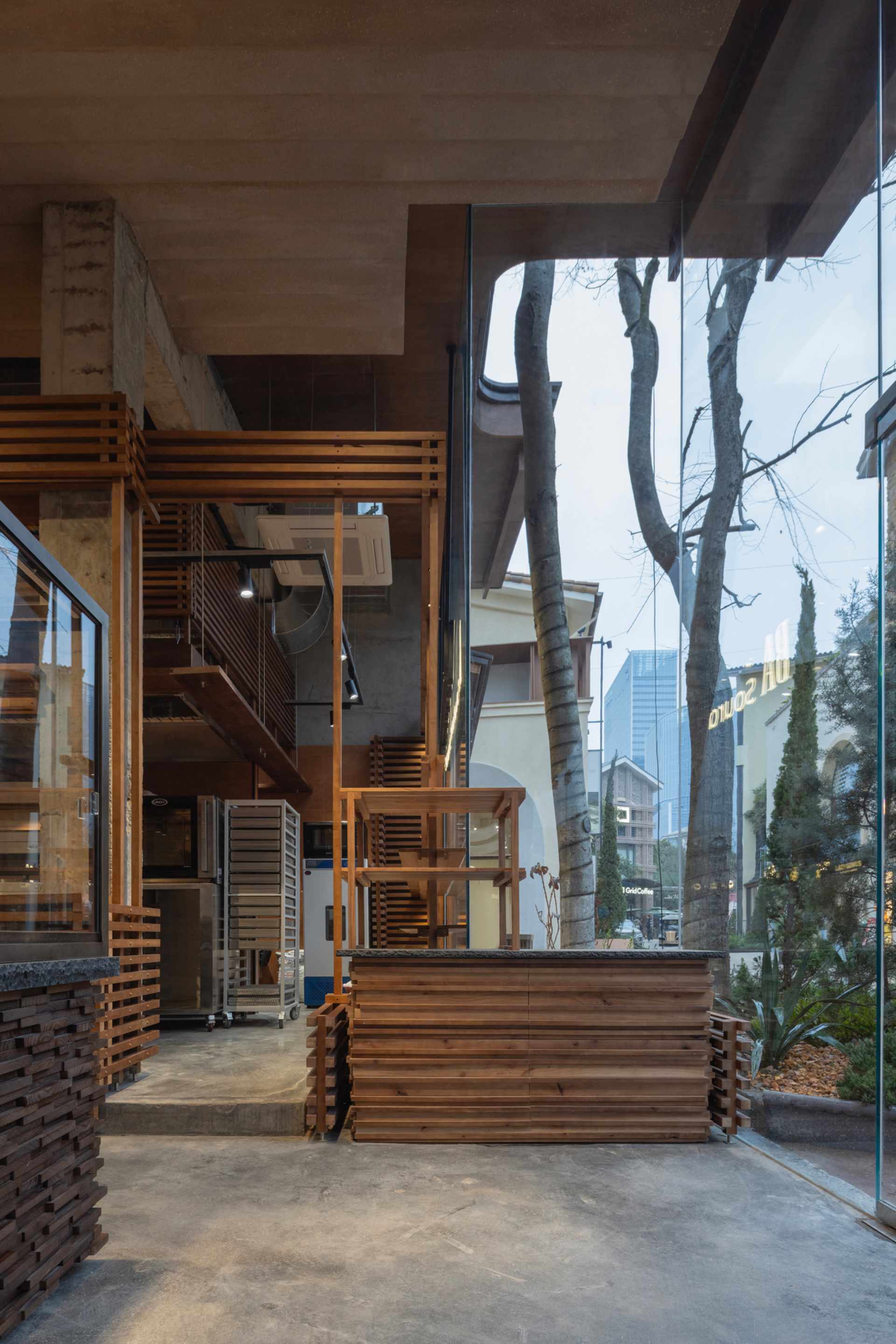 为保证室内的通透与秩序,选择以轻型搭接的木构模块界定出烘焙制作、收银、客座区域。木构模块可根据功能需求的变化,灵活拆组。空间中以基础的砂、石、木作为主要素材,呼应着自然发酵所需的原料亦是基础而纯粹的。