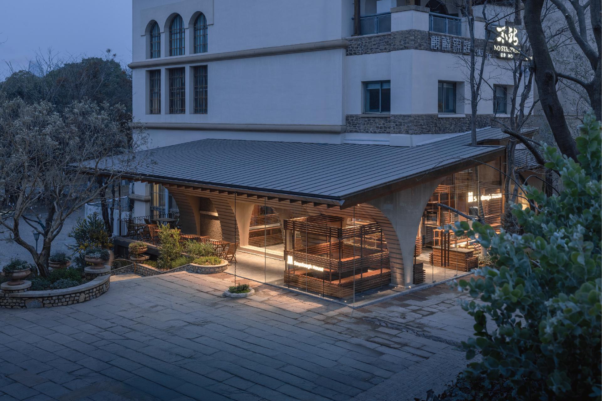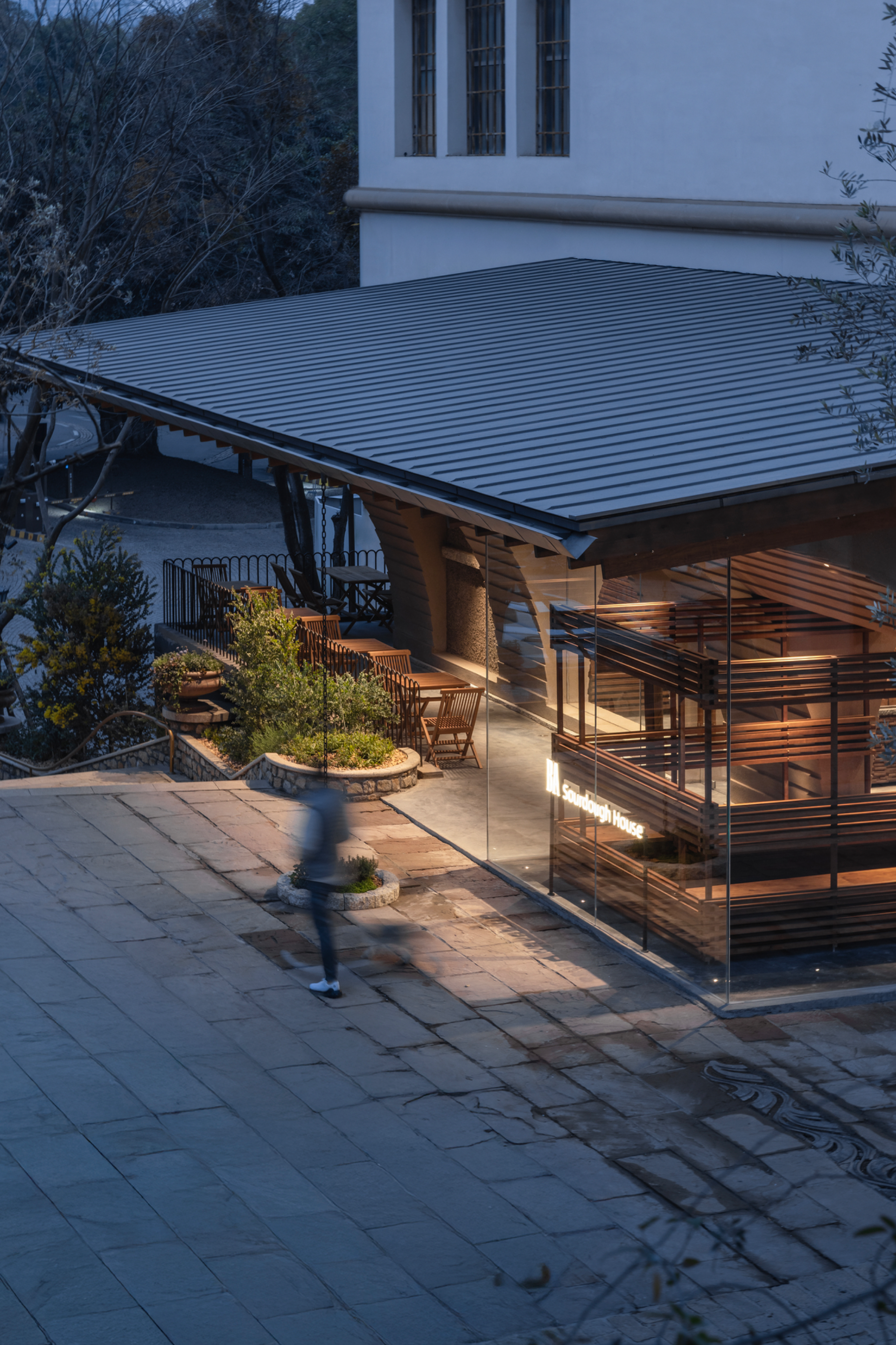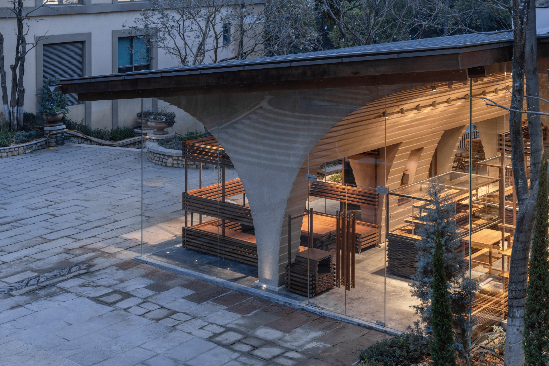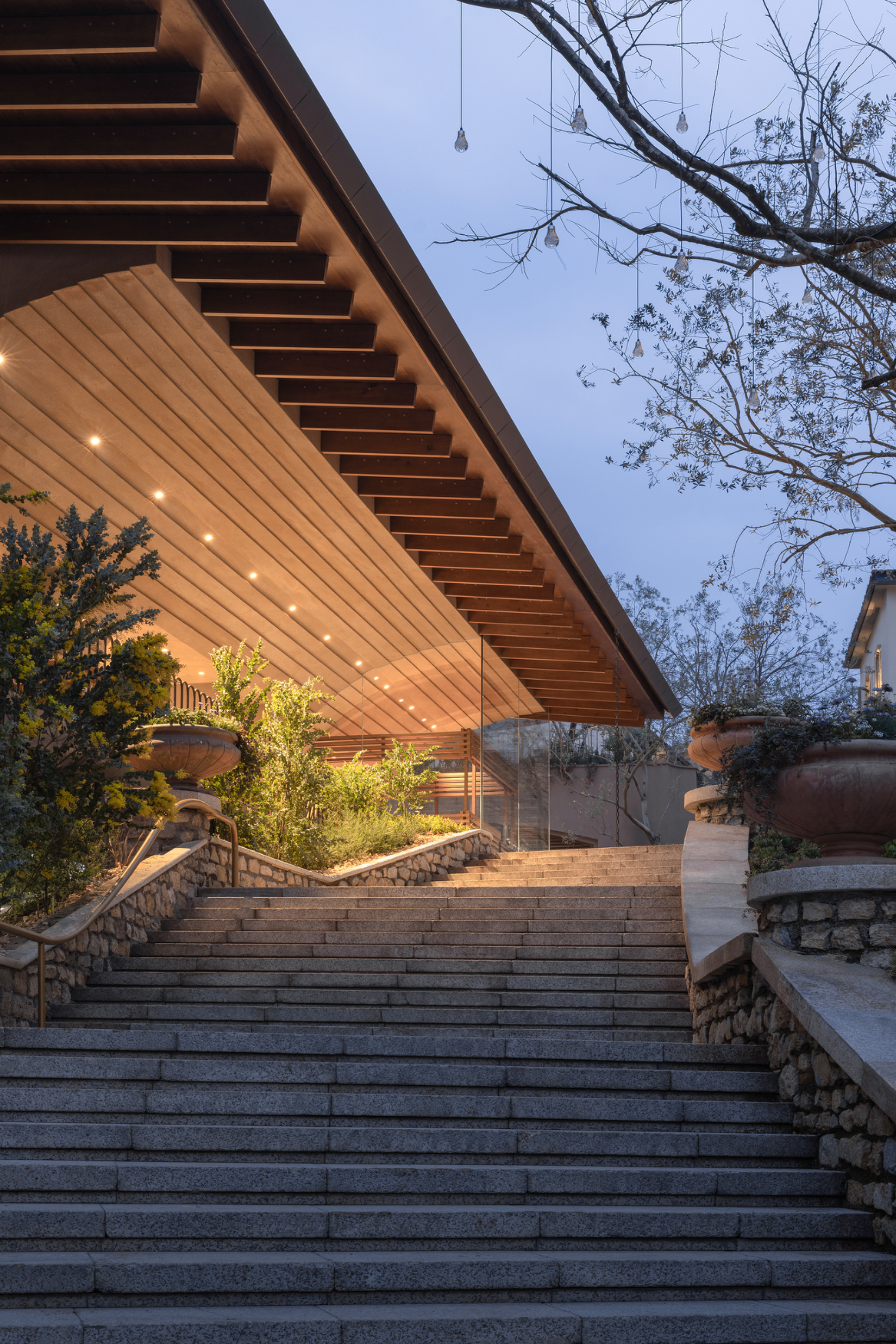 建筑主体由斜撑的钢结构支撑起倾斜的坡屋面。上沿嵌靠在原有建筑体中,下沿延伸挑出。再以层层叠级的双向拱形勾勒出生长姿态的建筑轮廓,重塑内外的边界与关系。
