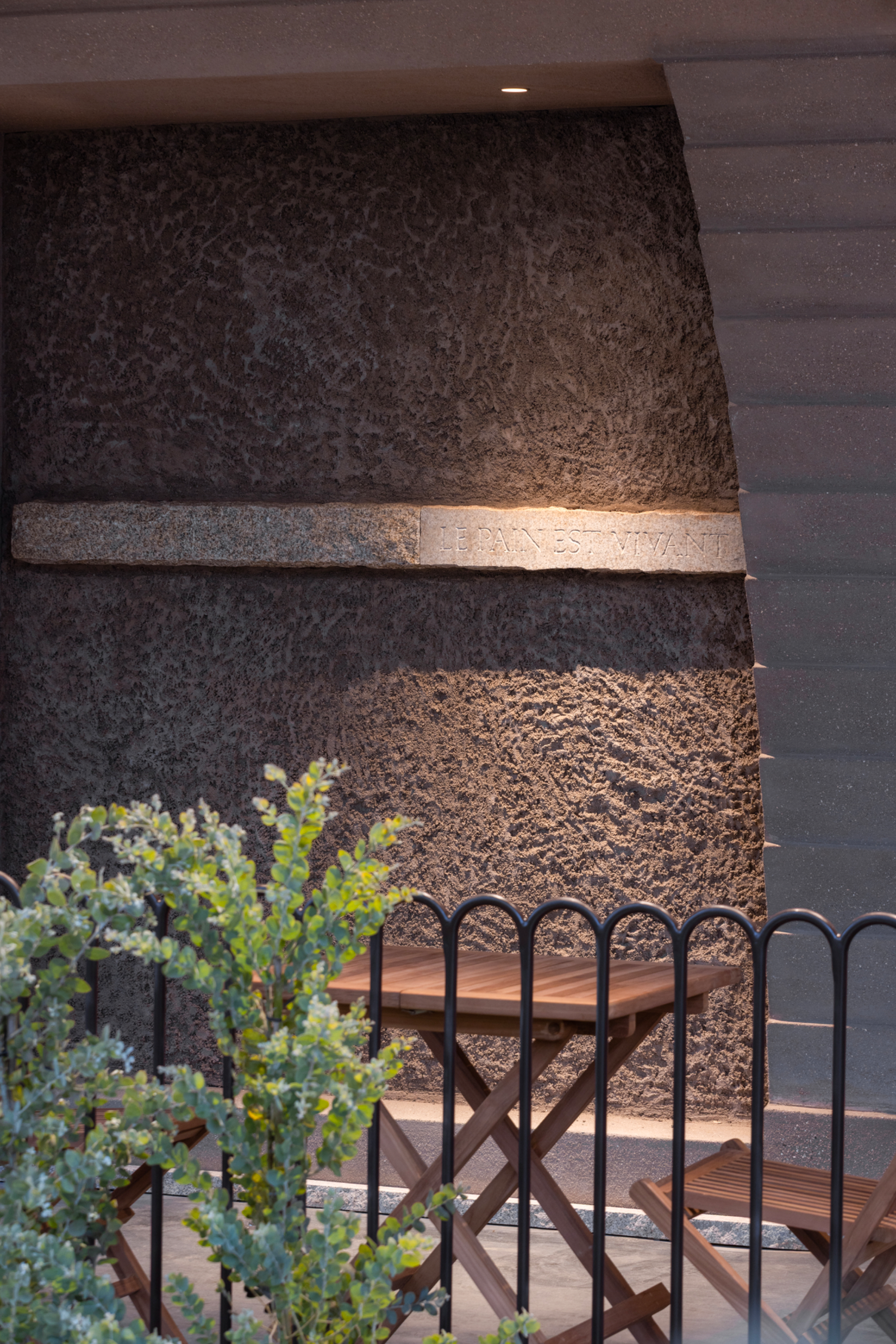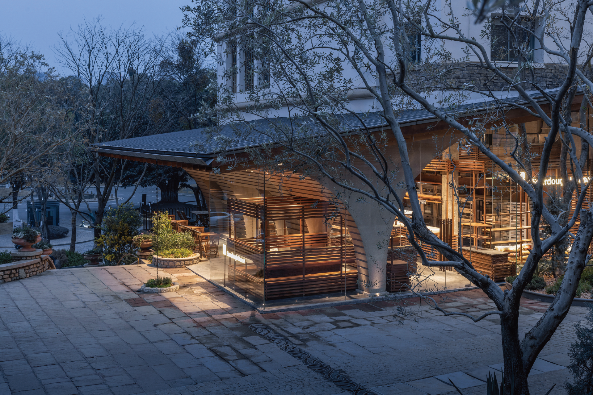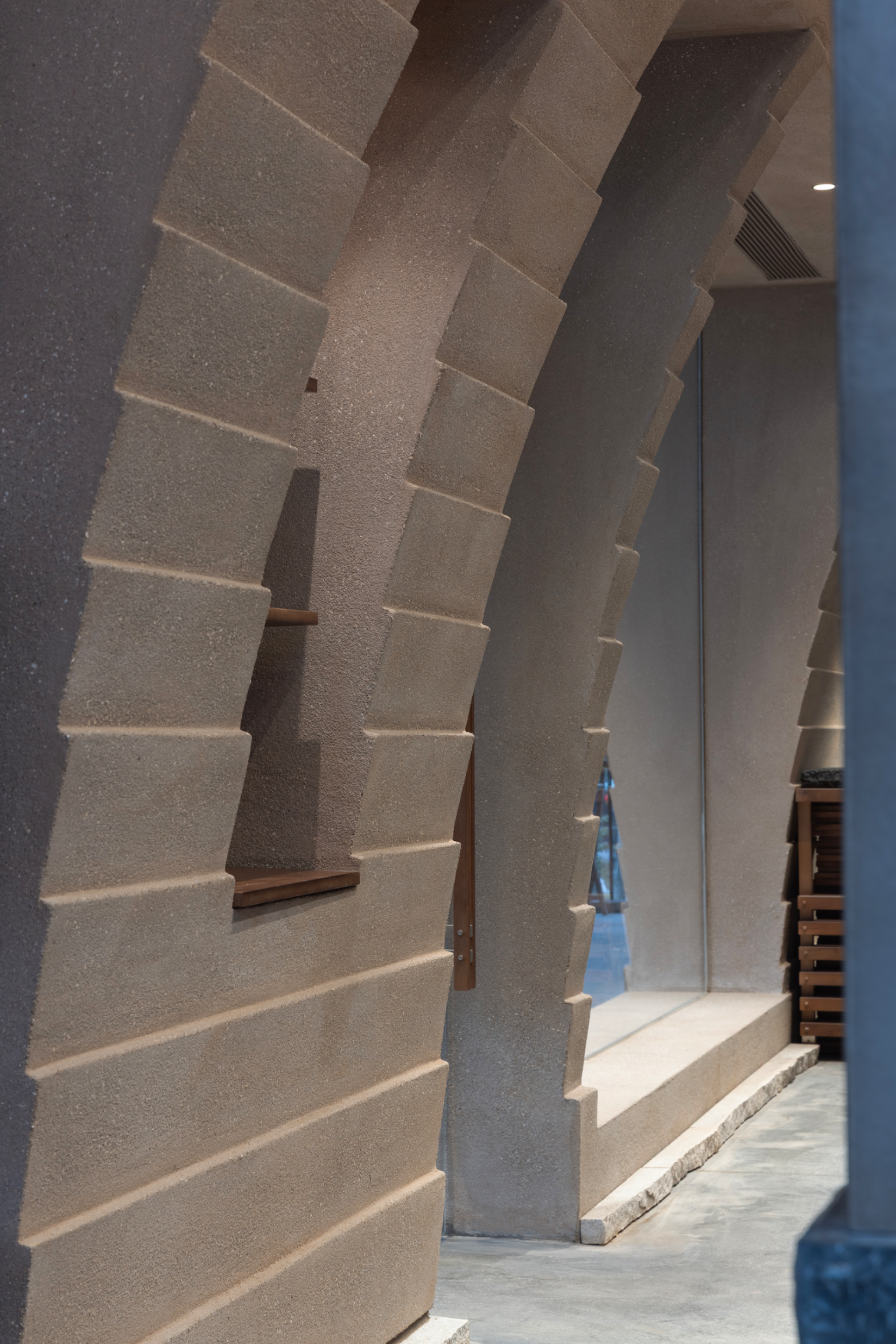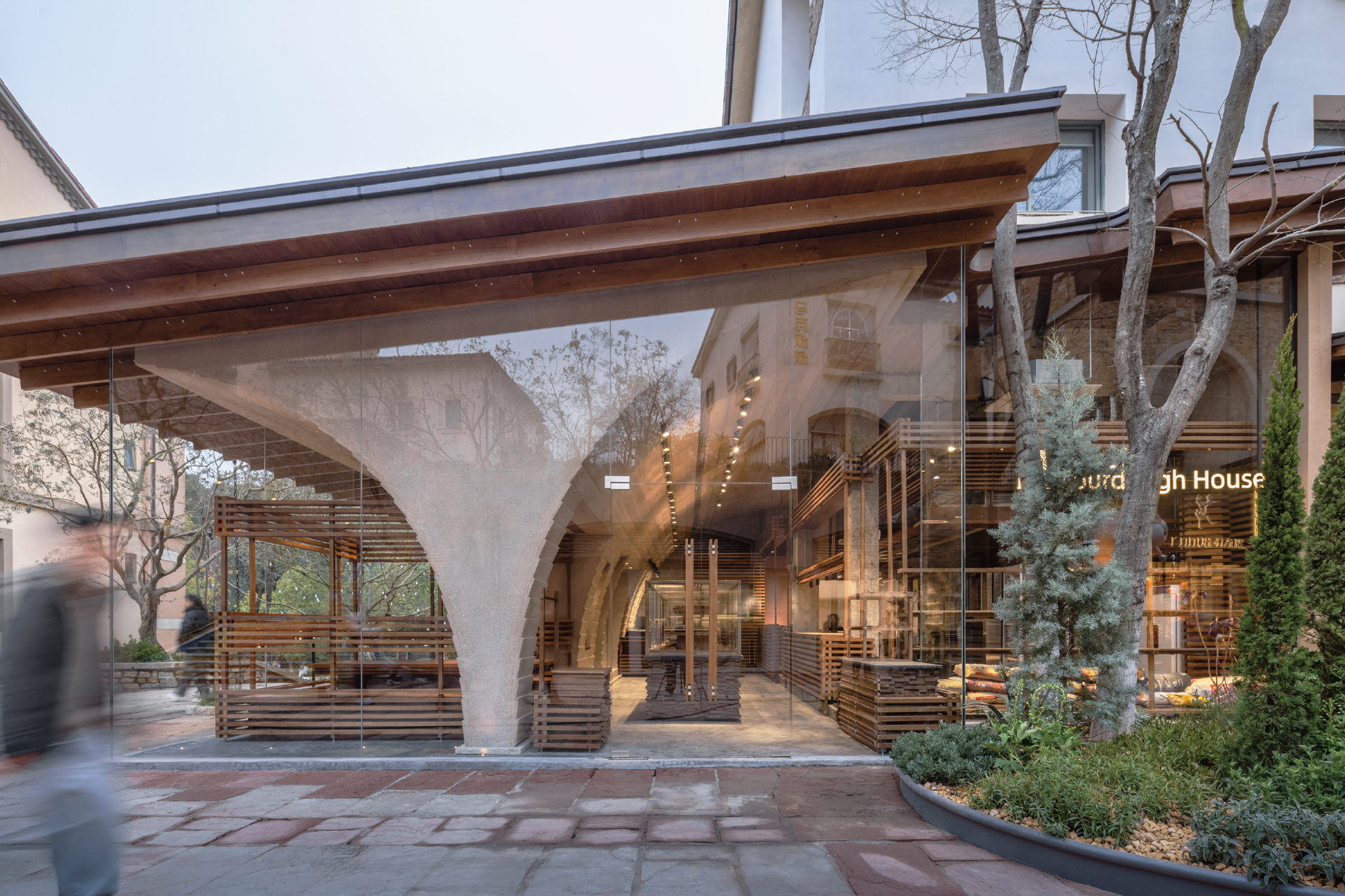 烘焙生产中的慢发酵工艺,源自欧洲。在西语中“酸面种”的另外一个词也叫“酵母种”。设计由此决定,以隐喻的母体般的建筑形态致敬生命。让发酵与时间对话,孕育新的风味与能量。屋檐之下生成具有包裹性的双向拱形空间,同时从功能上划分出室内与室外。自然地承载慢发酵的生产方式与街区日常的慢生活方式。