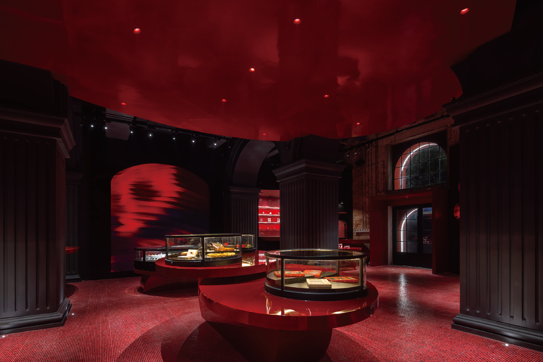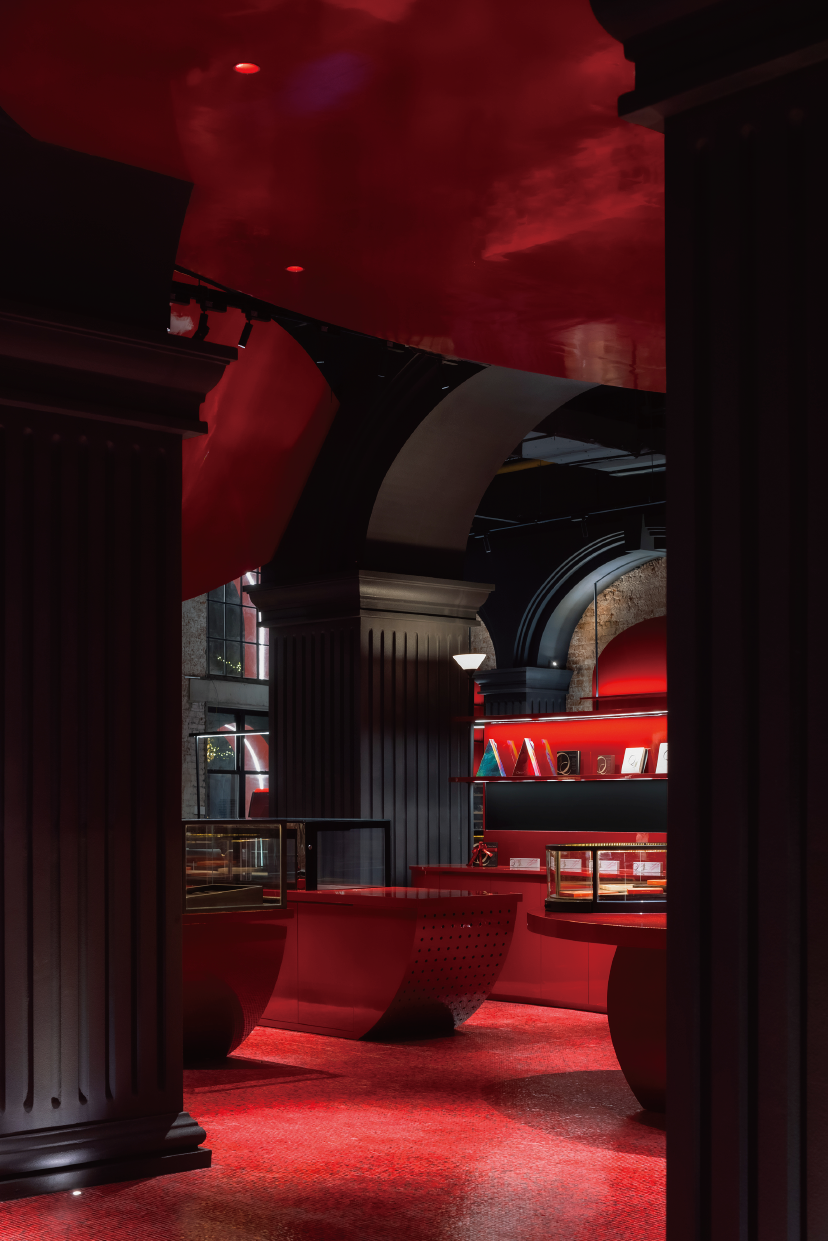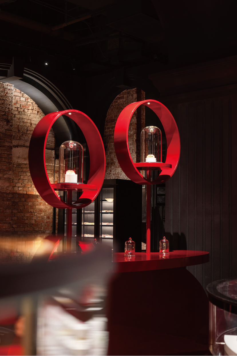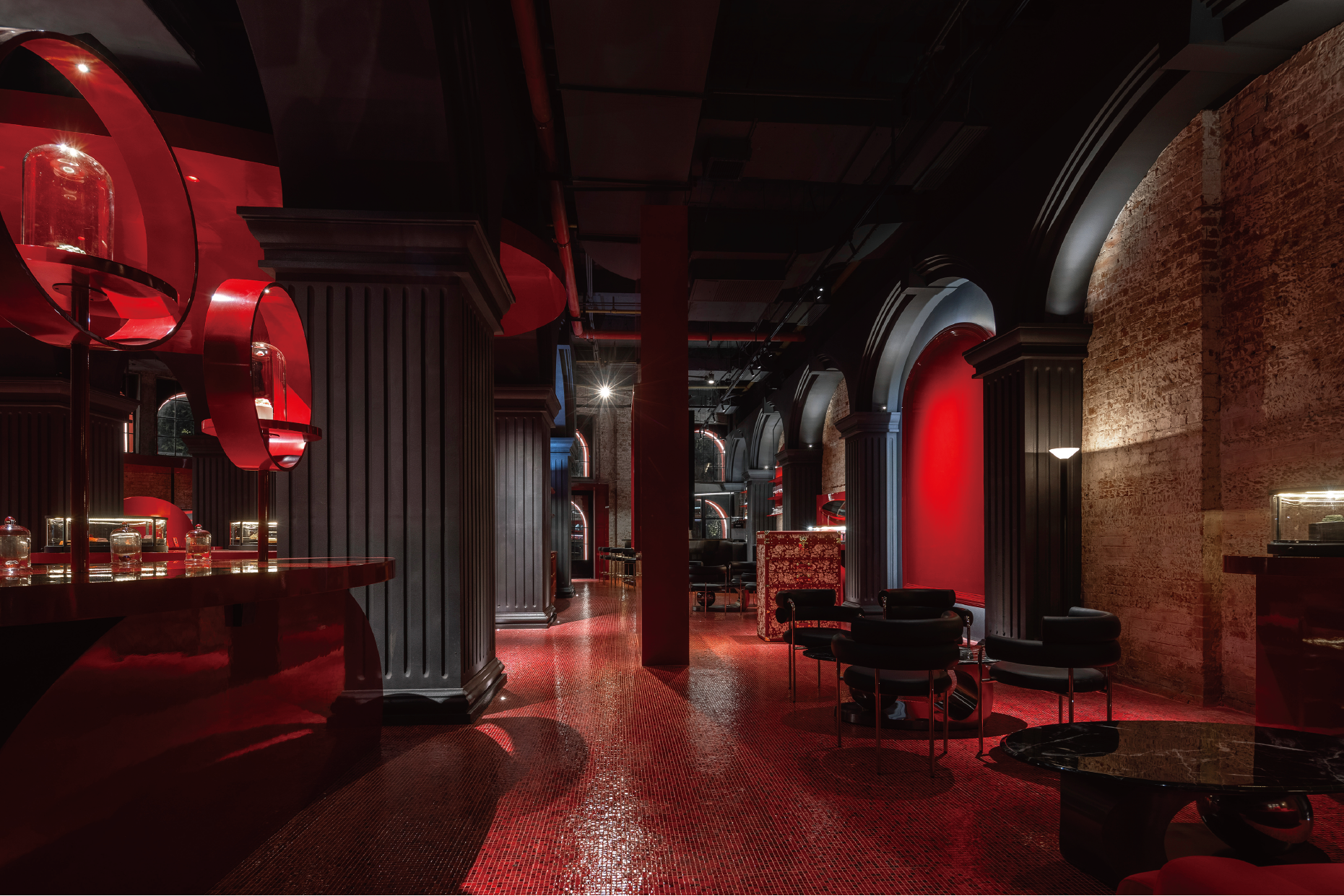 在不破坏原始柱体的前提下,将八根柱体重新包裹,并以连续拱圈的形式连接起来。柱体以模仿古典建筑的线条重构,呼应着街区的独特风貌。大胆的利用红与黑的色彩对比,形成热烈而不失稳重的空间色调。营造出极具艺术感的舞会氛围。抽象的玫瑰花瓣,似飘落进空间之中,形成了局部的空高变化。同时巨大的花瓣也成为了品牌形象的独特展示。