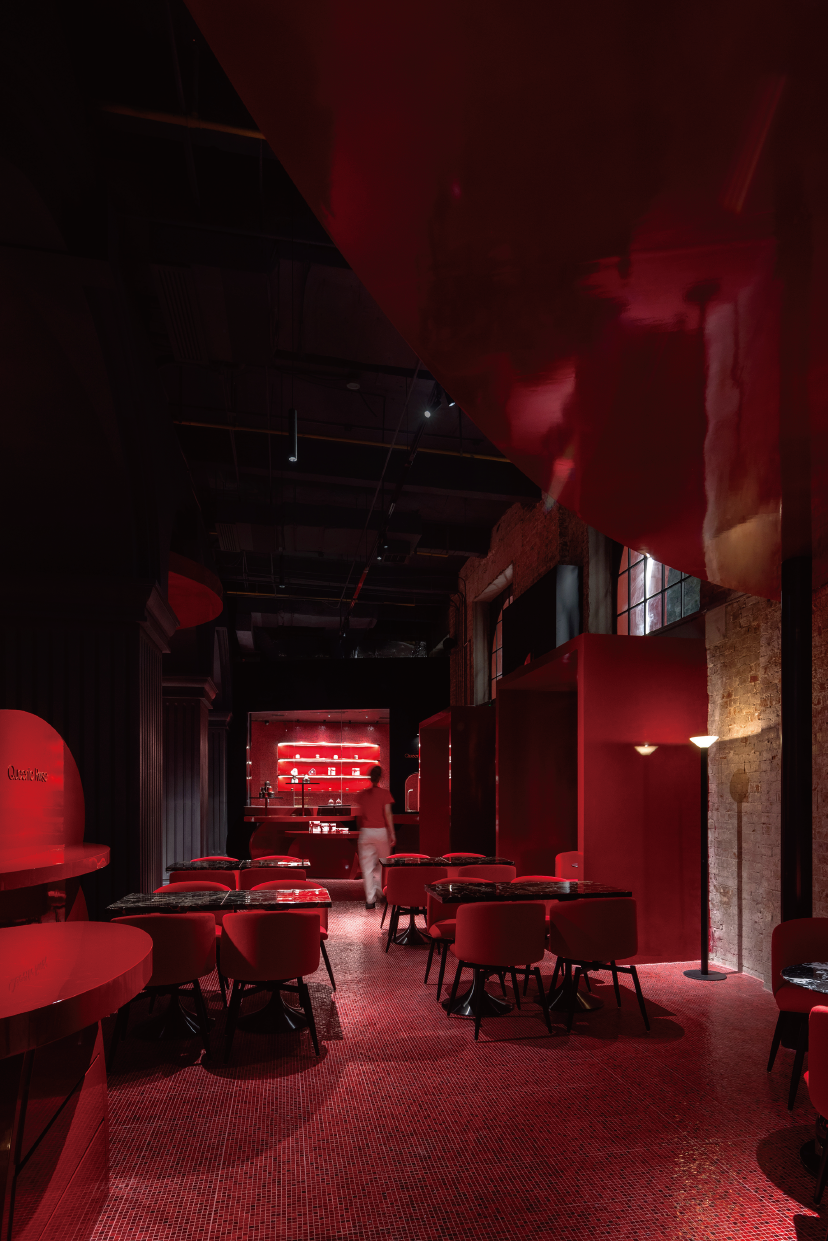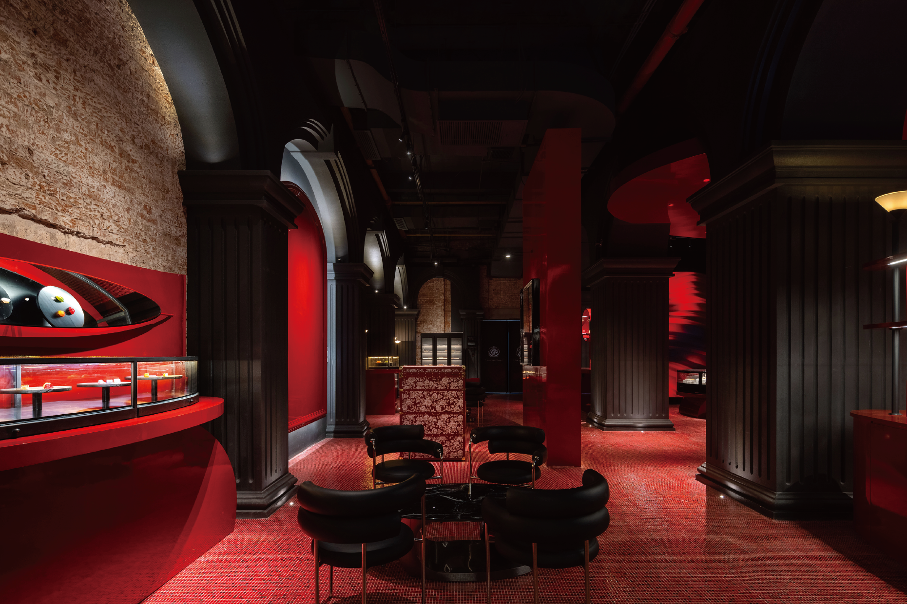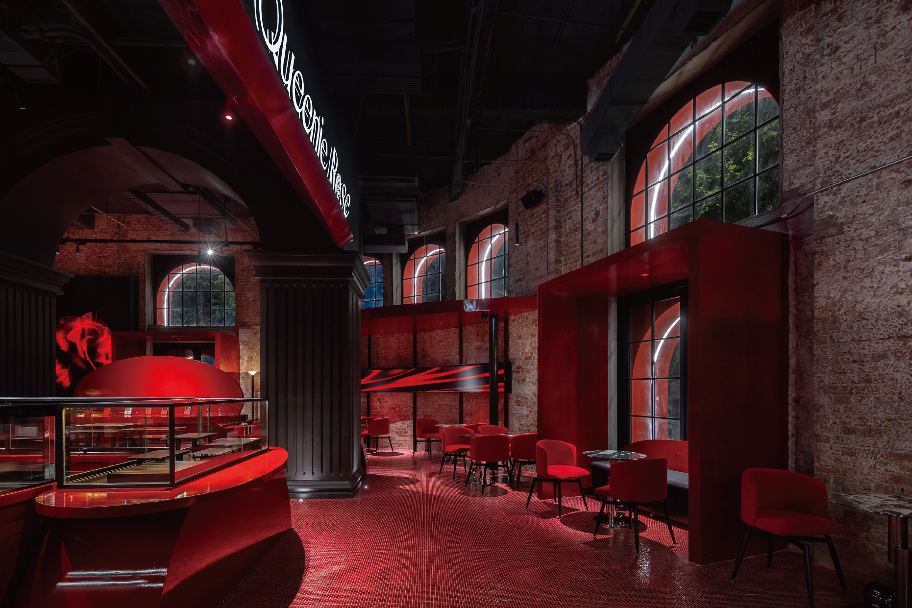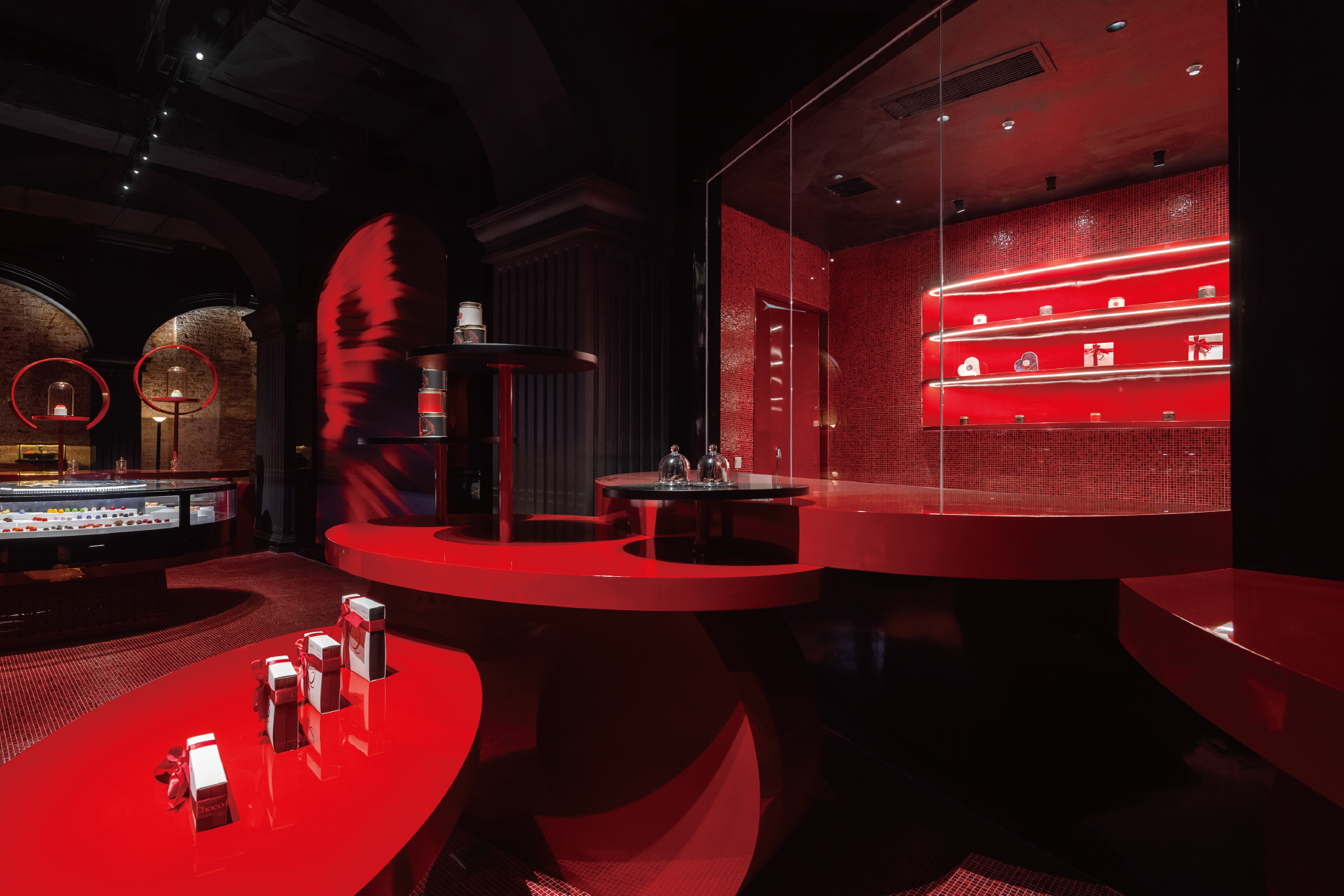 在不破坏原始柱体的前提下,将八根柱体重新包裹,并以连续拱圈的形式连接起来。柱体以模仿古典建筑的线条重构,呼应着街区的独特风貌。大胆的利用红与黑的色彩对比,形成热烈而不失稳重的空间色调。营造出极具艺术感的舞会氛围。抽象的玫瑰花瓣,似飘落进空间之中,形成了局部的空高变化。同时巨大的花瓣也成为了品牌形象的独特展示。