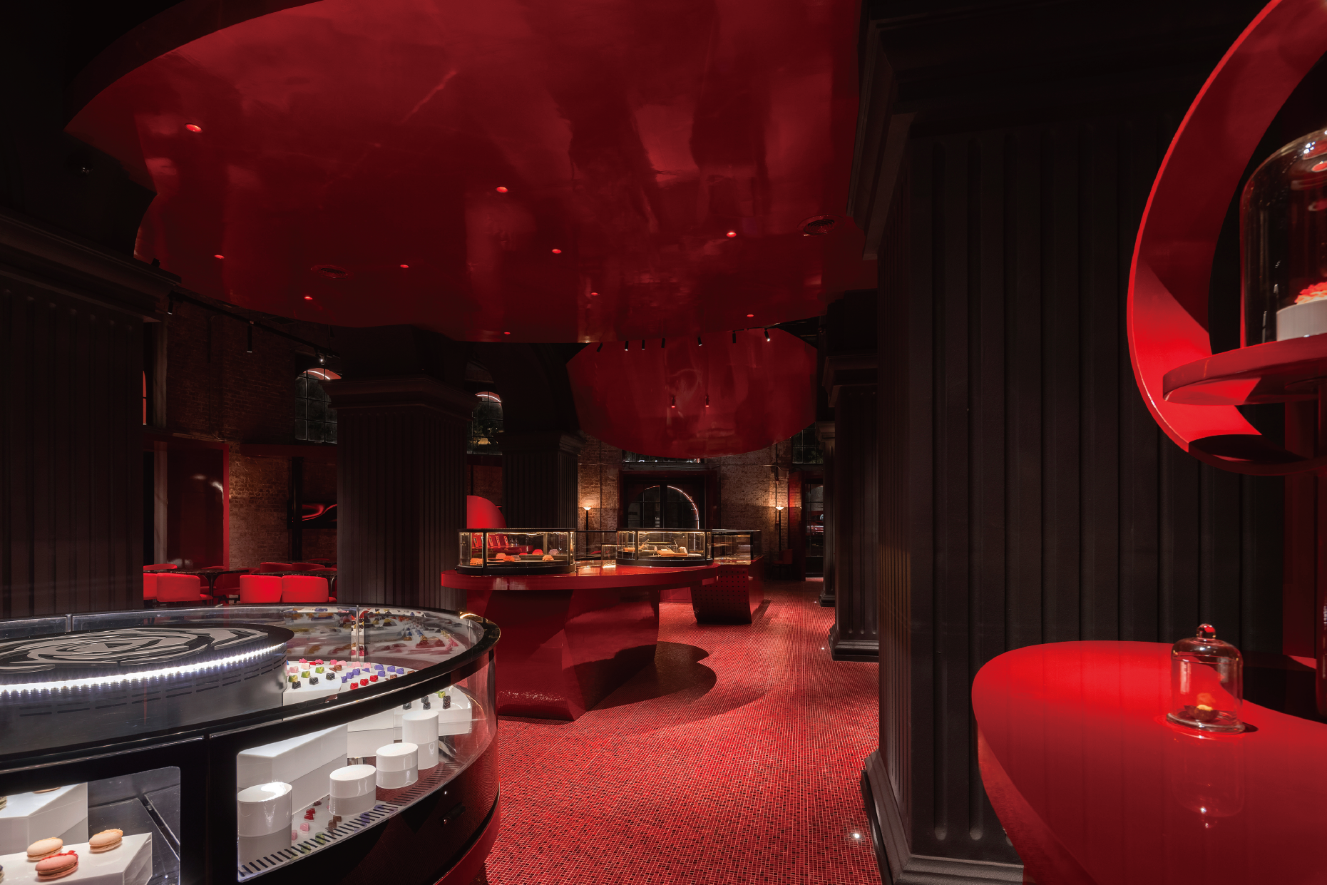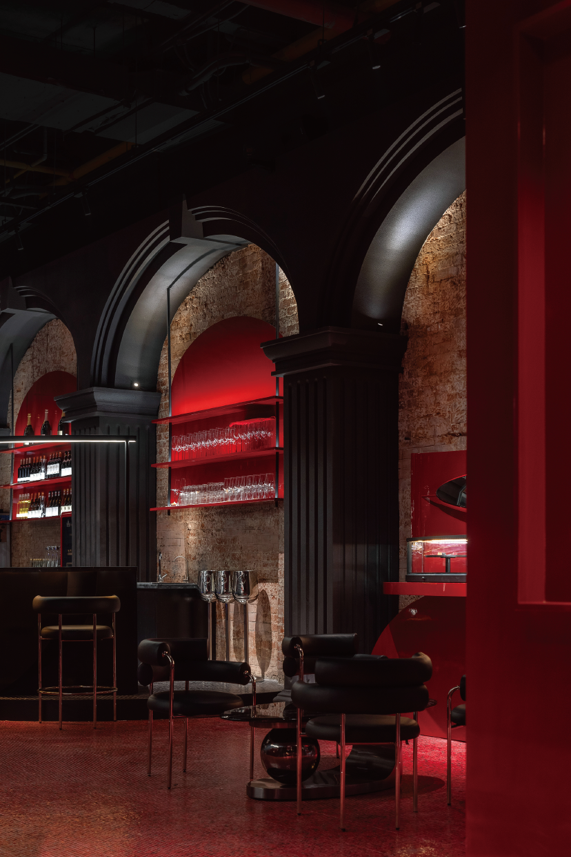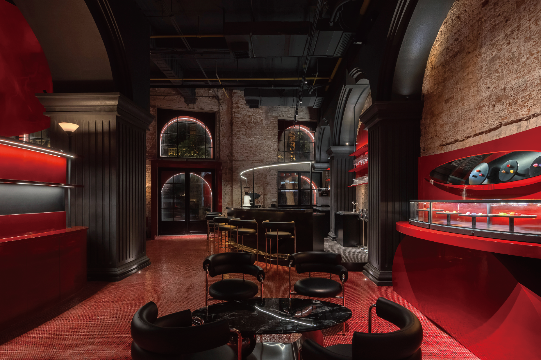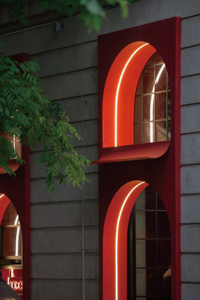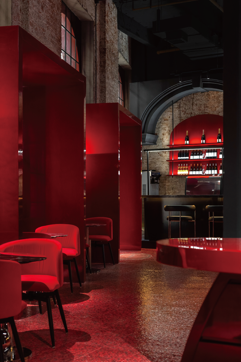 在不破坏原始柱体的前提下,将八根柱体重新包裹,并以连续拱圈的形式连接起来。柱体以模仿古典建筑的线条重构,呼应着街区的独特风貌。大胆的利用红与黑的色彩对比,形成热烈而不失稳重的空间色调。营造出极具艺术感的舞会氛围。抽象的玫瑰花瓣,似飘落进空间之中,形成了局部的空高变化。同时巨大的花瓣也成为了品牌形象的独特展示。