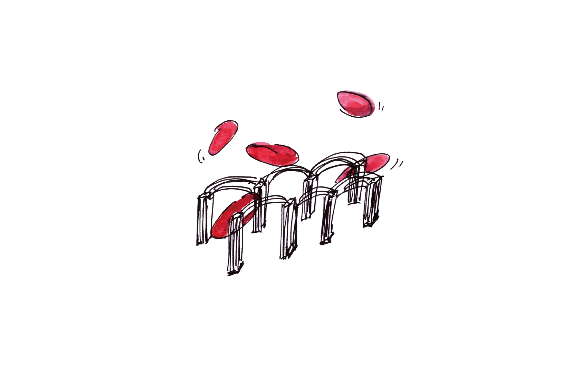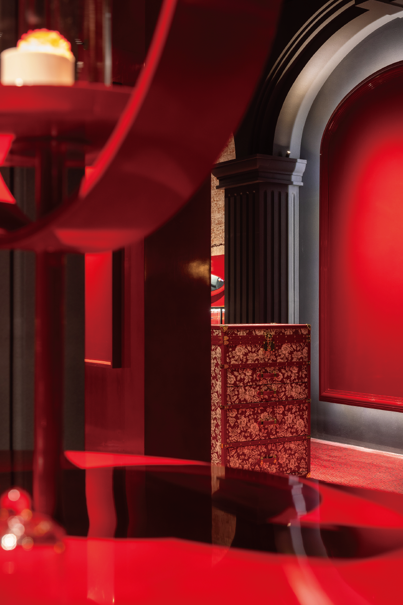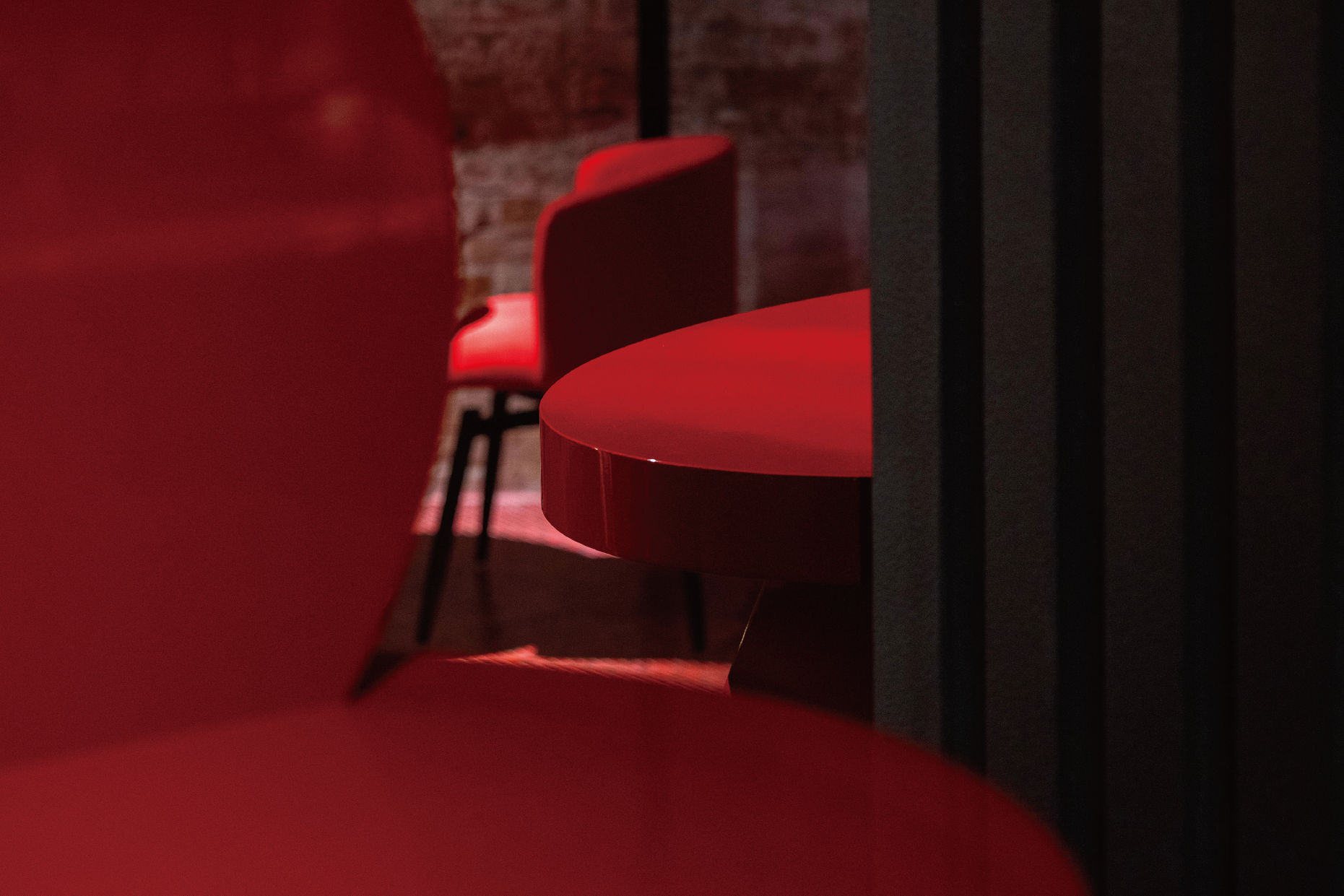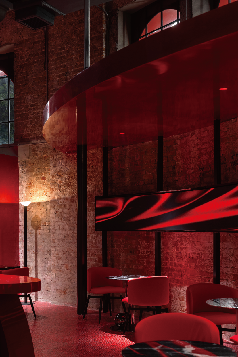 在不破坏原始柱体的前提下,将八根柱体重新包裹,并以连续拱圈的形式连接起来。柱体以模仿古典建筑的线条重构,呼应着街区的独特风貌。大胆的利用红与黑的色彩对比,形成热烈而不失稳重的空间色调。营造出极具艺术感的舞会氛围。抽象的玫瑰花瓣,似飘落进空间之中,形成了局部的空高变化。同时巨大的花瓣也成为了品牌形象的独特展示。